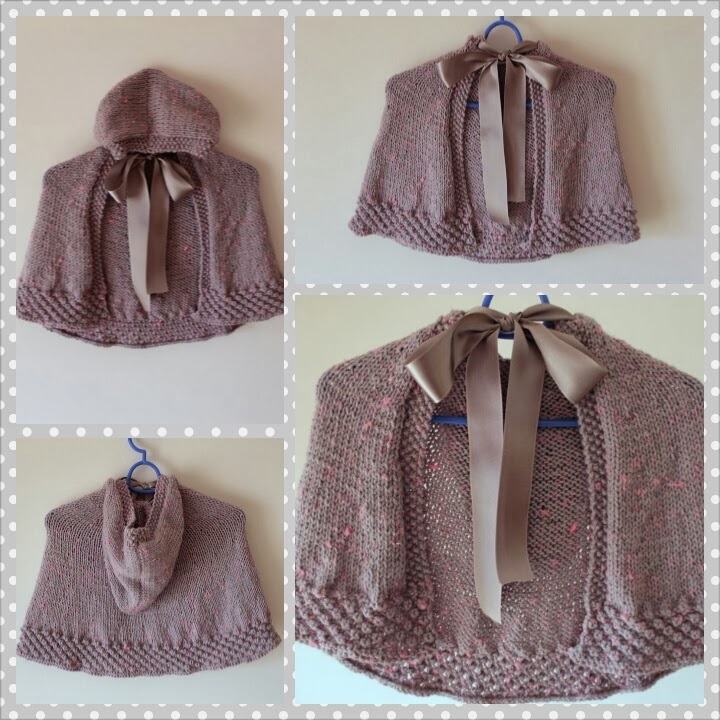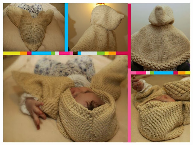 Capa com capuz em lã Baby Dot da Rosarios (77% acrilico, 20% poliamida e 3% poliester) com fita de seda. Adoro esta lã e o resultado final.